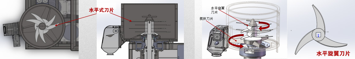 水平旋翼刀片 大面積水平旋翼式切割刀片,水平安裝于不同高度,同時作用于缸體內不同層面的顆粒上。較大增加了切割的效率。因為缸體內顆粒是隨著攪拌刀在做逆時針的圓周運動,而水平旋翼刀片是順時針旋轉,迎面而來的大顆粒被迅速切碎,切碎后的顆粒,又在刀片的水平表面迅速滾動成球。這種高效的成粒在傳統造粒機上是做不到的。 |