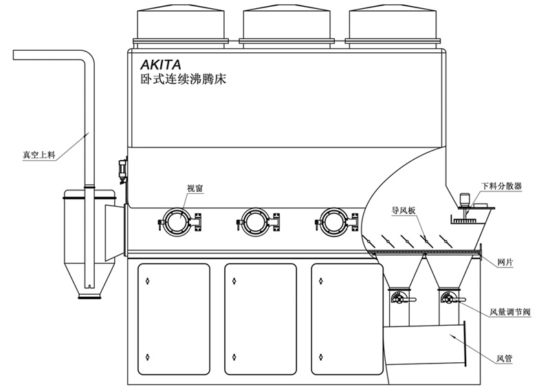 勻速定量的進料方式,結(jié)合了最新設(shè)計的可變導(dǎo)流板送風(fēng)系統(tǒng)(專利已送審),可控制物料前進速度,從而使進出料量實現(xiàn)平衡,達到連續(xù)化干燥的目的。