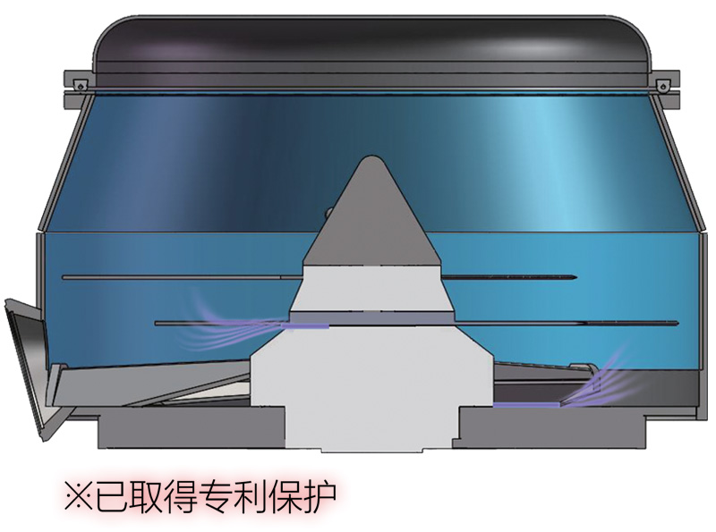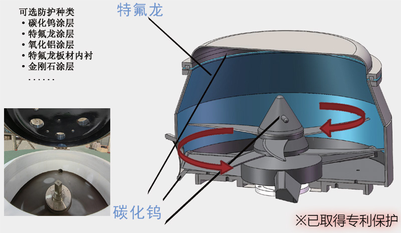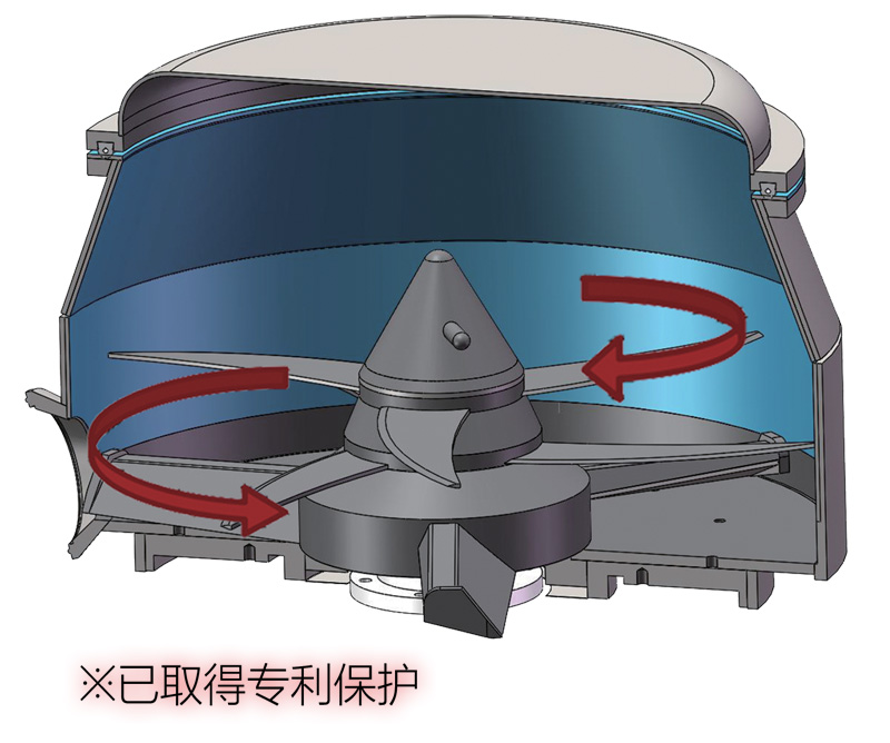 采用一組攪拌刀,一組水平旋翼式切刀,的雙軸雙傳動設計,可實現兩組刀片相對方向按照不同轉速運轉,通過特殊設計的刀片形狀,可產生巨大的剪切式對流效果,使物料能夠在短時間之內迅速混合、包覆。